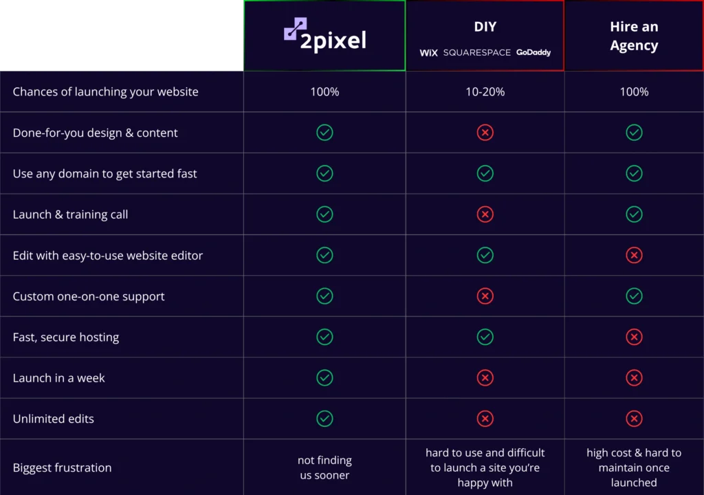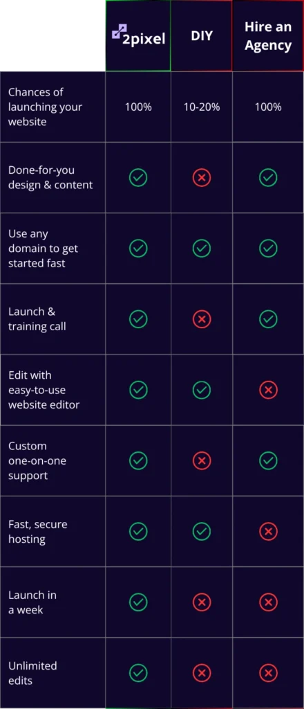 Your website is ready to do business from day one with our done-for-you online booking system and online store. You won’t pay a penny of commissions to 2Pixel for any business that you do.